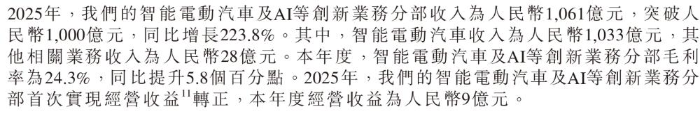 智能电动汽车及AI等创新业务2025年总收入1061亿元,同比增长223.8%,占集团总营收23.2%,较2024年提升14.2个百分点。其中智能电动汽车收入1033亿元,同比增长221.8%,主要因交付量增加及平均售价(ASP)上升。