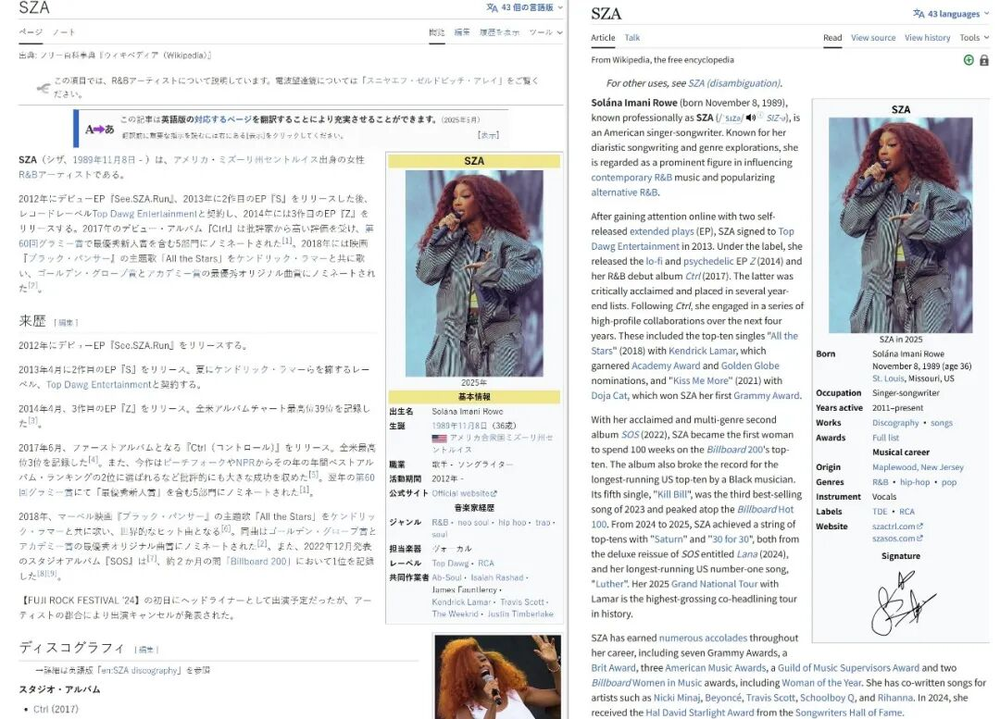 比如美国女歌手SZA,两版维基的词条长度相差十几倍