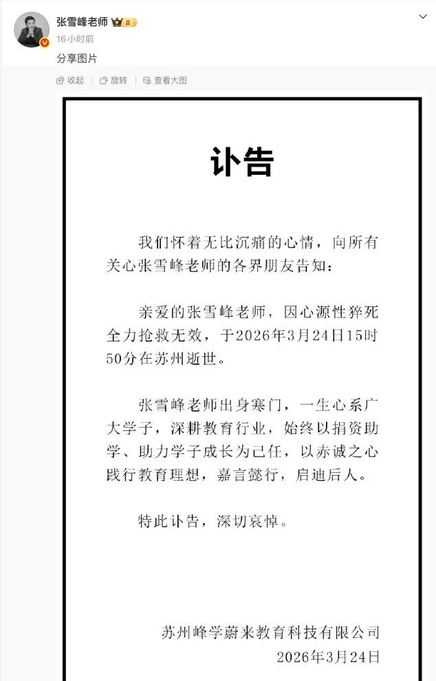 3月24日,教育领域标志性人物张雪峰因心源性猝死,经全力抢救无效在苏州离世,生命永远定格在41岁。