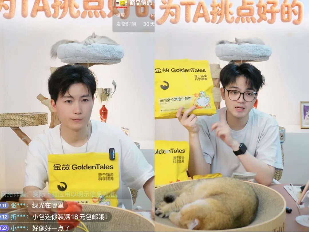 看似不羁,但博主给它三粒冻干“工资”,芬儿头就光速变脸,配合主人穿衣服,装扮后主人扒拉它嘴角,就露出职业假笑。“秦海璐大战邪恶银渐层”的桥段带来大量流量,带动直播间GMV提升。