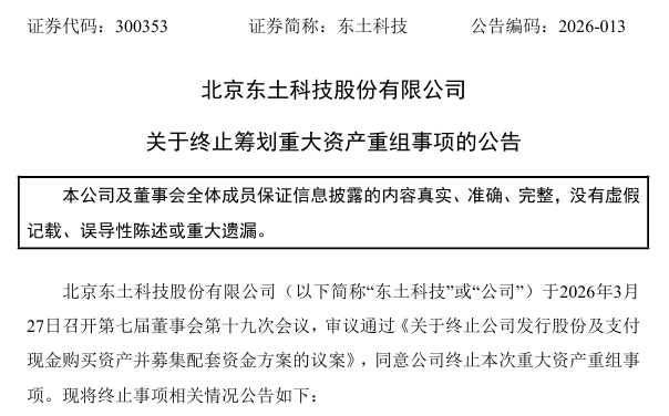 3月27日晚间,东土科技(股票代码:300353)发布公告称,公司于2026年3月27日召开第七届董事会第十九次会议,审议并通过了《关于终止公司发行股份及支付现金购买资产并募集配套资金方案的议案》,同意终止本次重大资产重组事项。