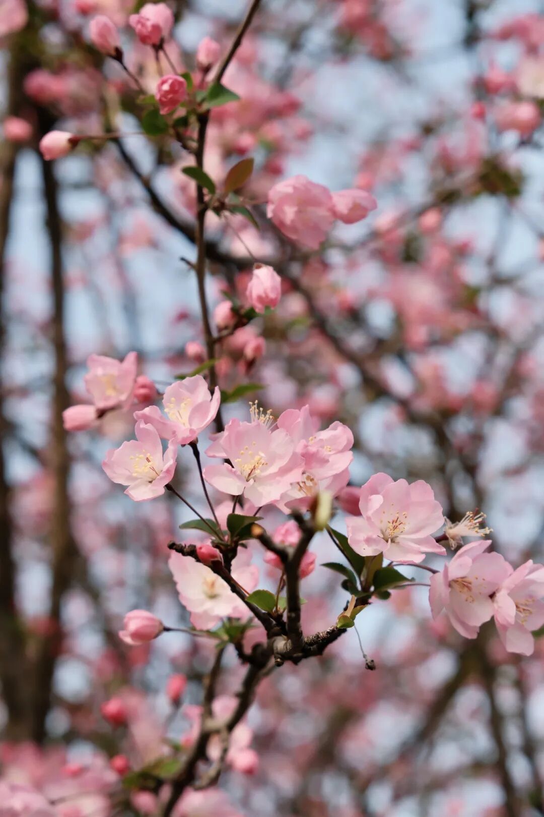 沉浸在素雅中时,南江公园的垂丝海棠正以绯红花簇绚烂绽放,热烈张扬,宣告春天就要轰轰烈烈!