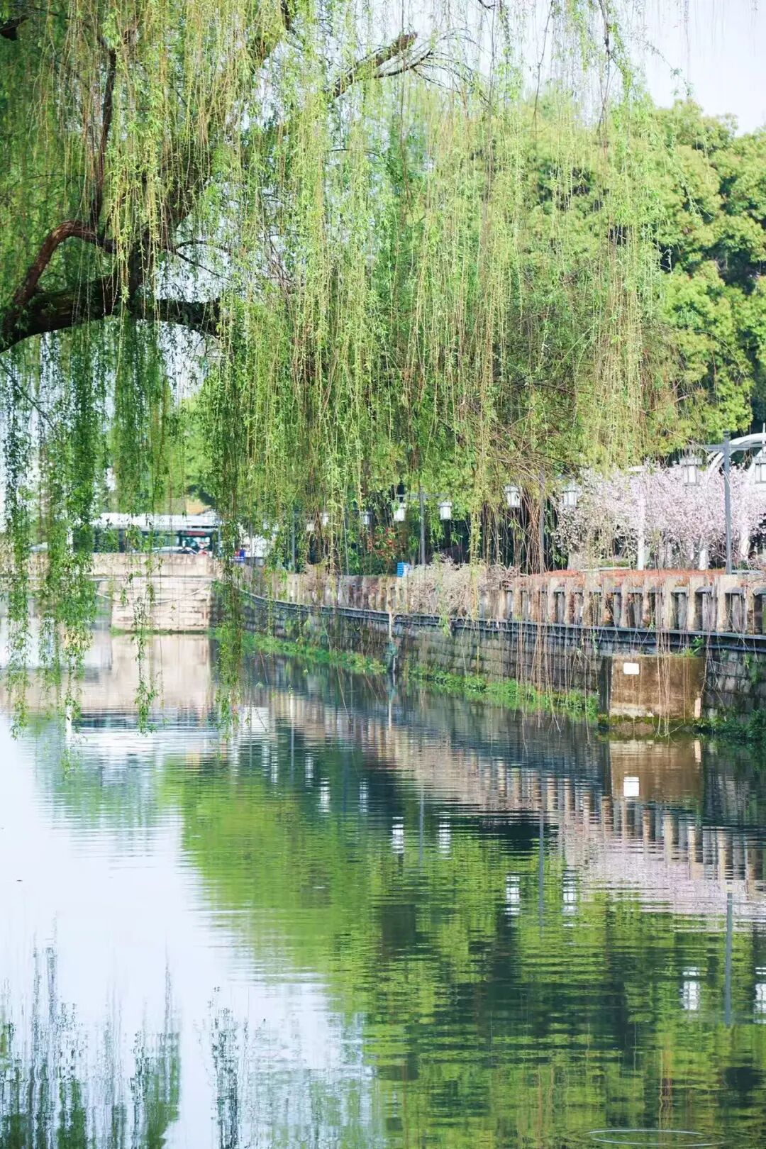视线下移,柳树新芽绿得心动。河岸边垂柳抽出嫩芽,是颜料盘上最鲜活的“初春绿”,纤细柳条随风轻摆,撩得一池春水波光粼粼。