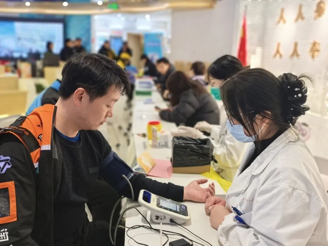 “三站合一”后服务资源得到集中升级,把健康服务送到外卖骑手身边。街道联合普陀区人民医院、社区卫生服务中心等共建单位,常态化开展健康科普讲座,提供专业心理咨询,还免费提供血压测量、血糖检测、眼科健康检查等服务,实现健康守护“零距离”。