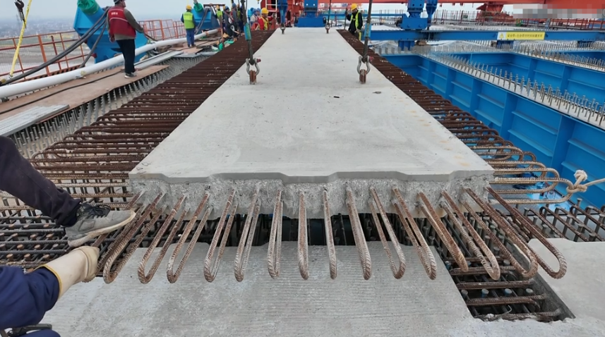 崇启公铁长江大桥的公路桥面板由一块块预制混凝土桥面板铺设而成,只有铺设的缝隙部分采用混凝土现浇。中铁大桥局北沿江项目部一分部副总工程师张晓波介绍:“混凝土桥面板在后场的养护期超过300天,收缩徐变已经达到设计要求,安装完成后再浇筑湿接缝混凝土,能让公路桥面的裂纹更少。”
