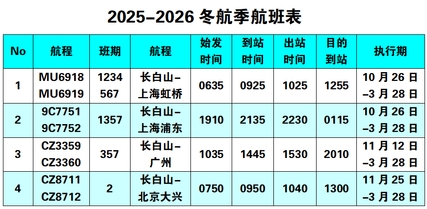 注:具体航班时刻请以航空公司当日计划为准。长白山机场问询电话:0439-6259111