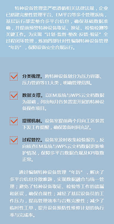运行部特种设备管理“年历”实践,是基层安全管理的创新范例。它精准解决多平台信息零散、基层执行缺乏明确指引的问题,通过“分类梳理+数据支撑+提前预警+双向管控”形成闭环体系,实现法律法规、系统平台与现场执行的有效衔接。该模式不仅实现100%定期检验率、高效更新台账等量化成果,保障设备合规运行,还通过优化编制主体、细化资料管理等压实责任,推动管理从“被动应对”转向“主动预防”。