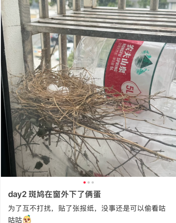 尽量避免频繁开窗、触碰巢穴,路过时放慢脚步,让斑鸠能安心孵蛋。斑鸠育雏时警惕性会提高,要是看到你靠近,可能会张开翅膀扑腾发出警告。