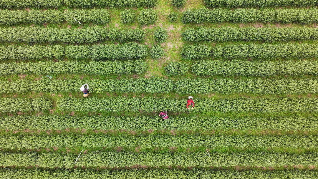 茶树间点缀着星星点点的野花,
