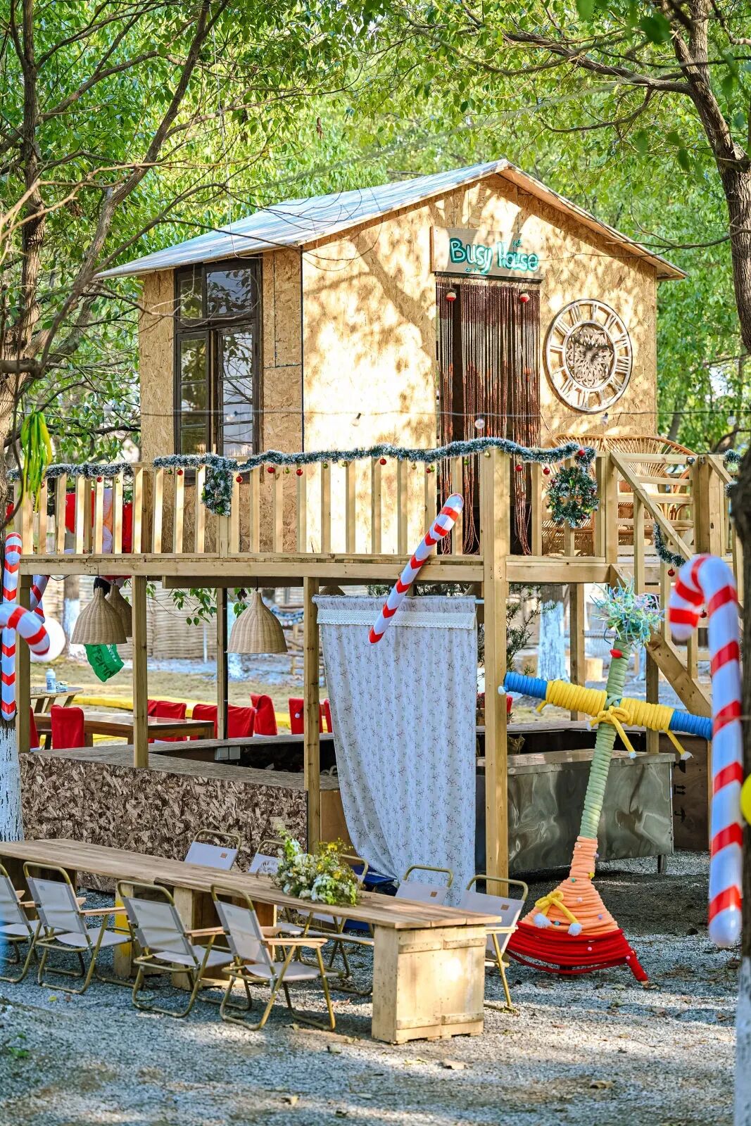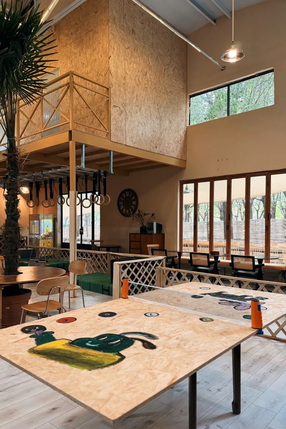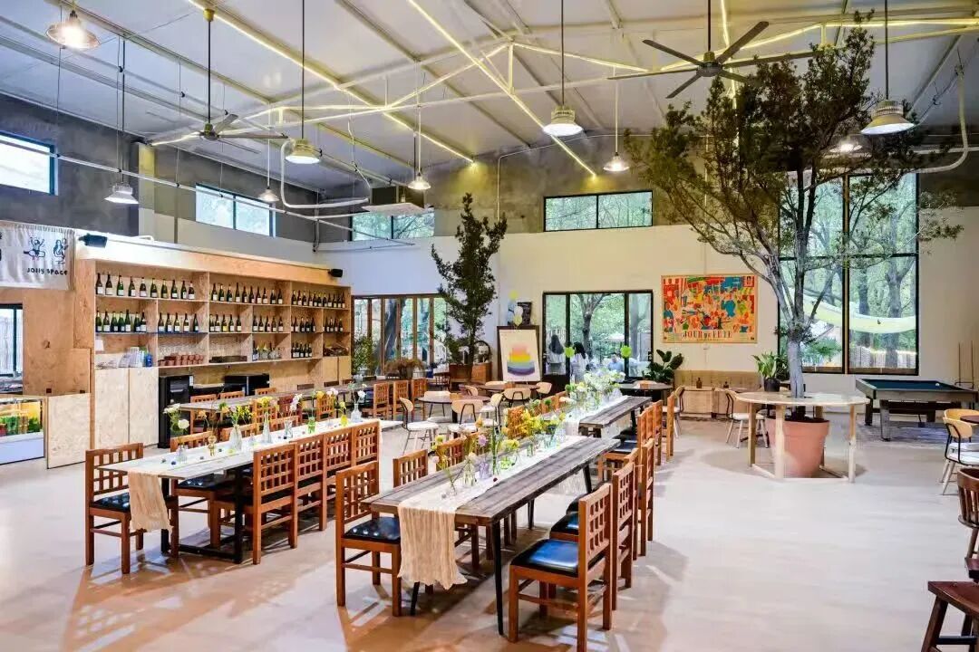 作为融合复古自然风室内空间与松弛乡野体验的复合型场地,Jolly Space拥有600平方米的通透室内区域,以及五亩多的私密户外森林。室内保留着天然的工业风,网球、匹克球场地、专业木工教室、儿童体能区、游乐区、阅读角与大舞台错落分布;室外林间,儿童体能空间、手工面包区、“鸭鸭幼稚园”、公益图书馆、户外音乐区等节点点缀其中,兼顾了趣味性与体验感。