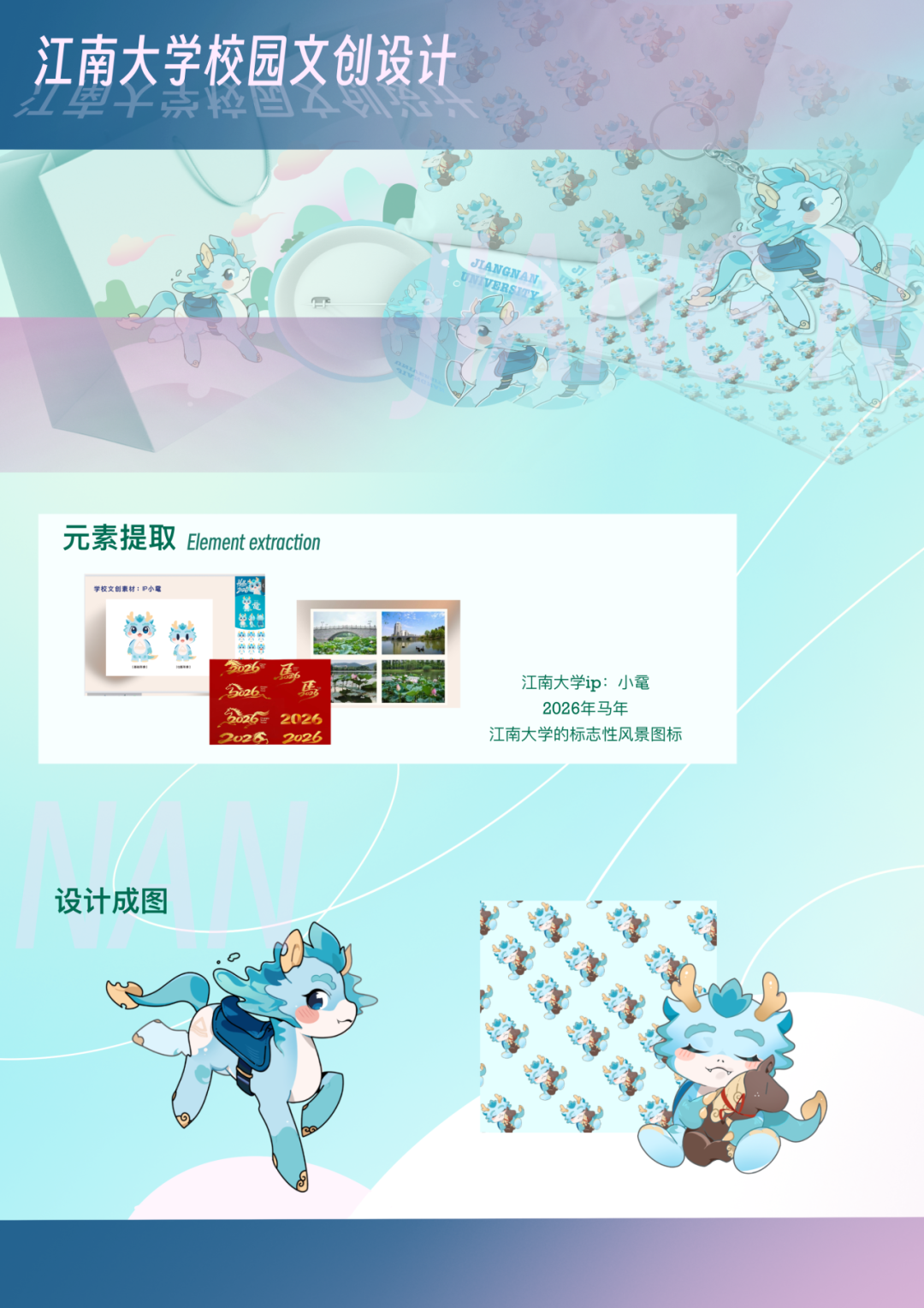 以江南大学IP小鼋为核心,融合2026马年元素,打造兼具校园辨识度与年节氛围的卡通形象。青蓝主色调呼应“太湖之滨”的文化基因,奔跑骏马形态象征学子锐意进取,“小鼋抱木马”传递新年温暖期许,满版纹样与多元文创让IP融入日常校园生活。