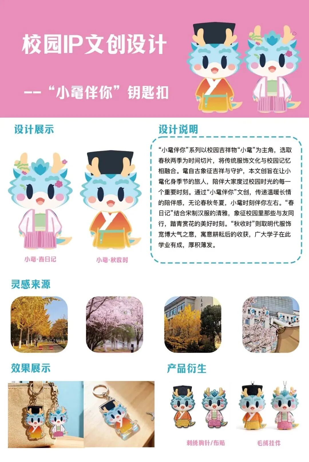 “小鼋伴你”系列以校园吉祥物小鼋为主角,选取春秋两季为创作背景,将传统服饰文化与校园记忆相融合。鼋象征吉祥与守护,该文创旨在让小鼋成为季节的使者,陪伴师生度过校园生活的每个重要瞬间。