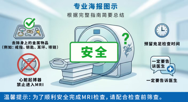 但也需要重视其强磁场环境带来的特殊风险,这些风险并非不可规避,检查前的充分准备、金属物品的彻底清除、自身身体情况的如实告知,是保障检查安全的关键。每一位受检者严格遵守检查要求,既是对自身健康负责,也是对医疗安全的保障。作为放射科医护人员,会对每位受检者进行全面的检查前评估,严格把控检查指征,提供专业的检查指导。也希望广大受检者主动了解MRI相关知识,积极配合医护工作,通过医患协作,让MRI检查的诊断价值充分发挥,为疾病的早发现、早诊断、早治疗筑牢基础。
