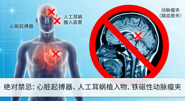 MRI设备的磁场强度非常高,1.5T设备的磁场强度约为地球磁场的3万倍,3T设备达到6万倍,铁磁性物品会被强烈吸引产生“导弹效应”,造成人身伤害和设备损坏,所以MRI检查有严格的禁忌症和安检要求。体内有心脏起搏器、人工耳蜗、铁磁性动脉瘤夹、眼内铁磁性异物,以及植入某些早期铁磁性金属植入物的人严禁做MRI检查。进入扫描室前,首饰、带金属配件的衣物、钢圈内衣、手机、钥匙、假牙、助听器、含金属丝的假发等必须去除;含金属微粒的化妆品需要卸妆;文身因为颜料可能含有金属,需提前告知医生。妊娠早期一般不建议检查,妊娠期避免使用钆对比剂;幽闭恐惧症患者可以预约开放式设备、使用抗焦虑药物、佩戴耳塞等方式缓解,部分医院允许家属陪同;严重肾功能不全者避免做增强MRI,防止引发肾源性系统性纤维化;体内有金属植入物的人,需要确认材质(现代钛合金骨科内固定物大多可以进行检查),并向医生提供相关资料;推车、拐杖等大型金属物品,严禁进入磁体间。