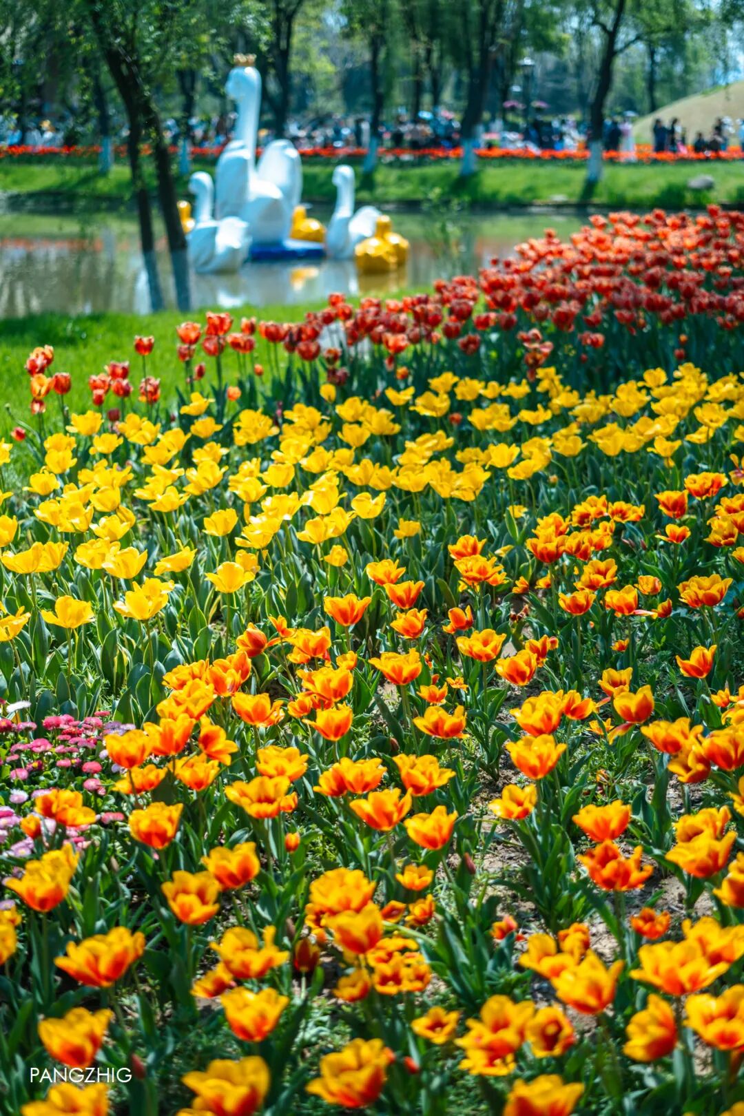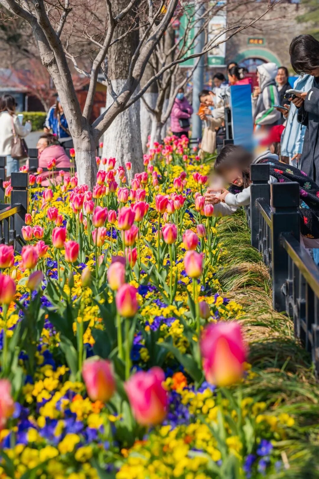 2️⃣玄武湖:湖边的郁金香浪漫值拉满,大片粉色花朵像打翻的调色盘,氛围温馨。