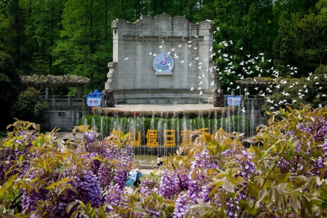2️⃣音乐台:鸽子飞过紫藤花的画面绝美。这里集齐森林、建筑、白鸽与音乐喷泉,清风、花香、白鸽纷飞,氛围感拉满。
