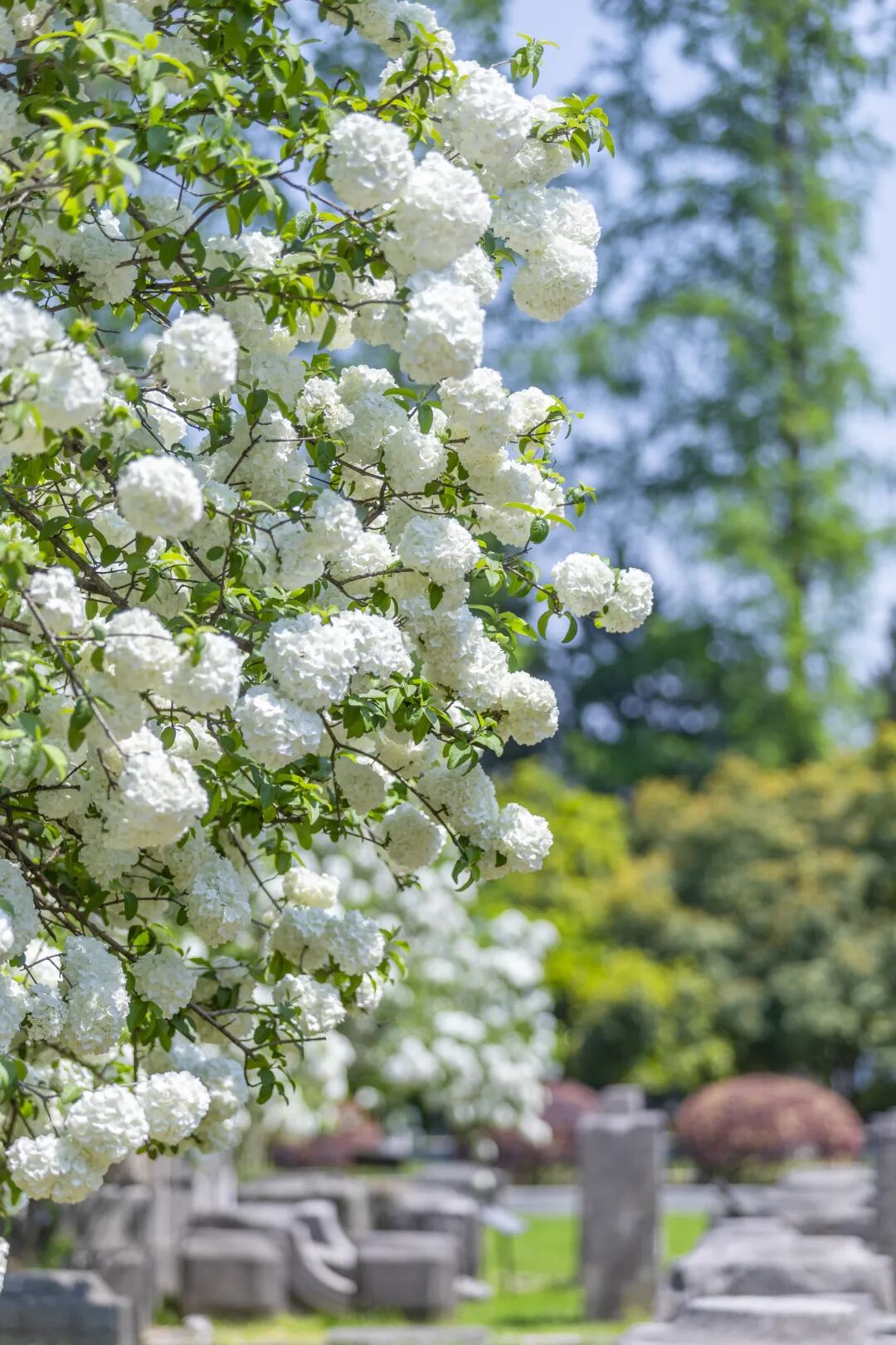 2️⃣午朝门公园:古遗址与木绣球搭配,历史感与春日浪漫交融。斑驳石础诉说朝代更迭,木绣球却让古迹生出温柔生机。