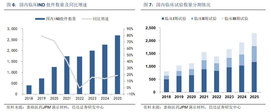 融资回暖的红利快速传导至临床研发端:2025年国内临床IND批件数量达2703个,同比增长19%,临床试验数量加速增长,其中早期临床阶段增长尤为显著——I期试验数量同比增13%,II期试验数量同比大增42%。早期临床的高增长预示着行业将迎来新一轮需求高峰。