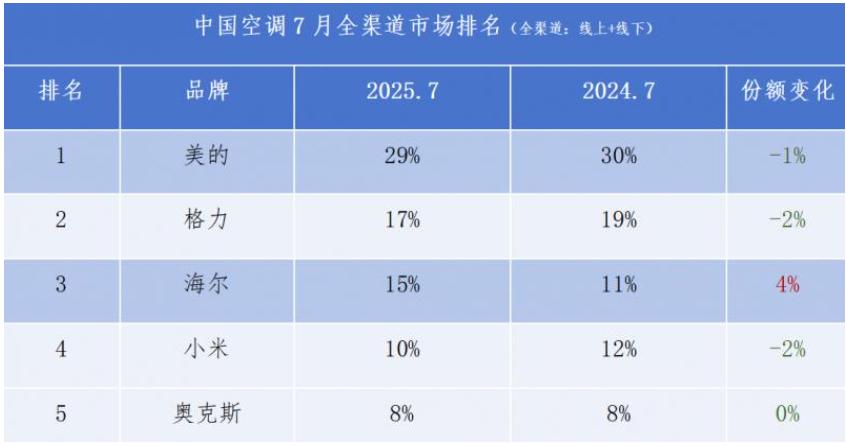 奥维云网数据显示,2025年7月中国空调全渠道市场份额中,美的、格力、海尔、小米位列前四,奥克斯以8%份额居第五,市场地位难复当年。