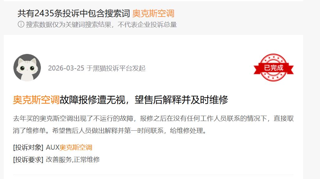 研发投入不足制约核心竞争力,压缩机此前依赖外购,2025年6月芜湖压缩机工厂才投产;智能化方面,奥知音II Pro空调侧重语音对话等表层功能,更像宣传噱头。黑猫投诉平台上,奥克斯空调有超2400条投诉,涉及质量、售后等问题。