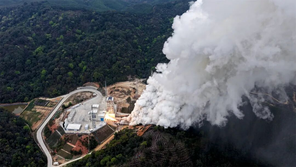 图:试车中的星际荣耀焦点二号发动机。发动机从研制到首飞,通常需经历累计数万秒的试车过程。