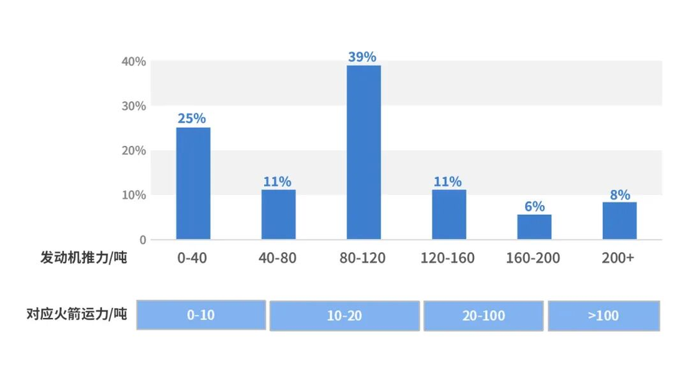 我国商用航天发动机虽型号众多,但参数指标并非均匀分布,存在一定的“扎堆”现象。以关键的推力指标为例,四分之三的发动机集中在0-120吨区间,对应火箭入轨运力在20吨以内。