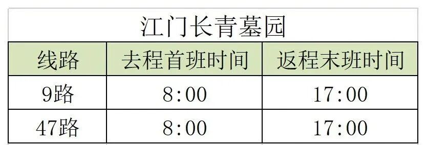 常规公交方面,江门长青墓园(蓬江区西区工业北路86号)将开通免费祭扫便民专线,时间为4月4日-6日每日8:00—17:00,站点包括紫茶公交站、青少年宫站、怡康华庭站、天河小苑站、金汇豪庭站、金汇广场站、蓬江区府站、环市办事处站、农林东路站、江门市人民政府站、江门长青墓园。同时,9路、47路终点站将延伸至长青墓园,时间为3月28日-29日、4月4日-6日、4月11日-12日共7天,每日8:00—17:00。