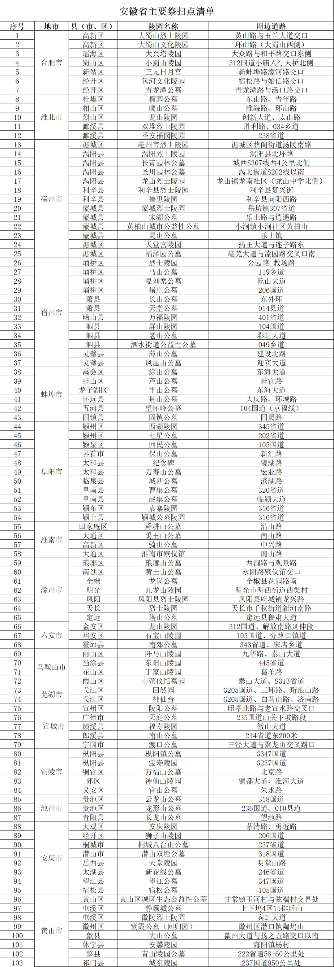 清明节将至,群众祭扫、踏青出游等活动集中,省内墓区、景区周边的车流和人流预计会显著增加。安徽公安交管部门依据实际出行情况,整理了省内主要祭扫点信息及交通出行指引,提醒广大群众错峰出行、文明祭扫,安全有序地缅怀先人。