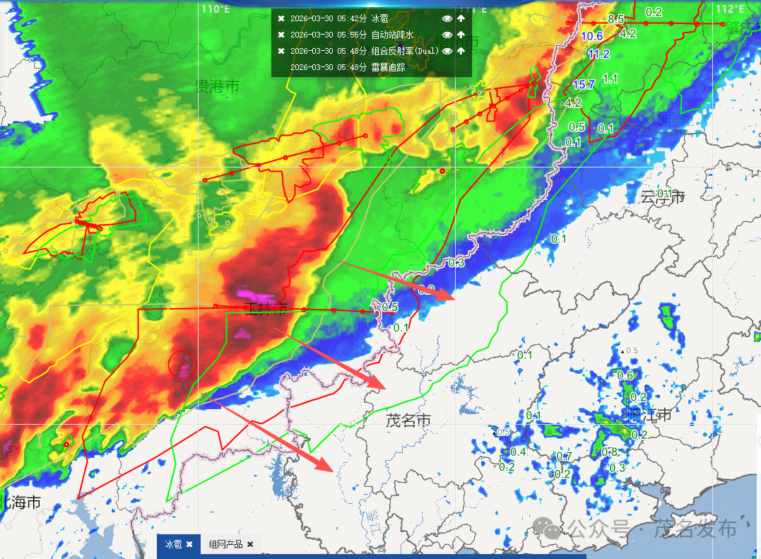 【茂名强对流天气预警】当前广西玉林地区有强飑线正在发展,并向东南方向移动。受其影响,预计未来3小时内,我市大部分区域将出现强雷雨天气,部分地区还可能伴随小冰雹、9到11级短时大风以及短时强降水等强对流现象。