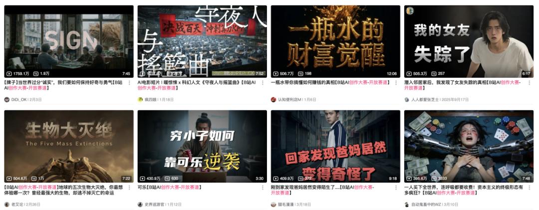 从这一角度看,B站优势直接,其本身就是以创作者为中心的UGC社区。AI创作大赛自1月5日启动以来,因创作者直接上传作品参赛,成果显现最快。目前B站AI内容日均投稿量同比增长83%,每月超8000万用户在平台观看AI相关内容。