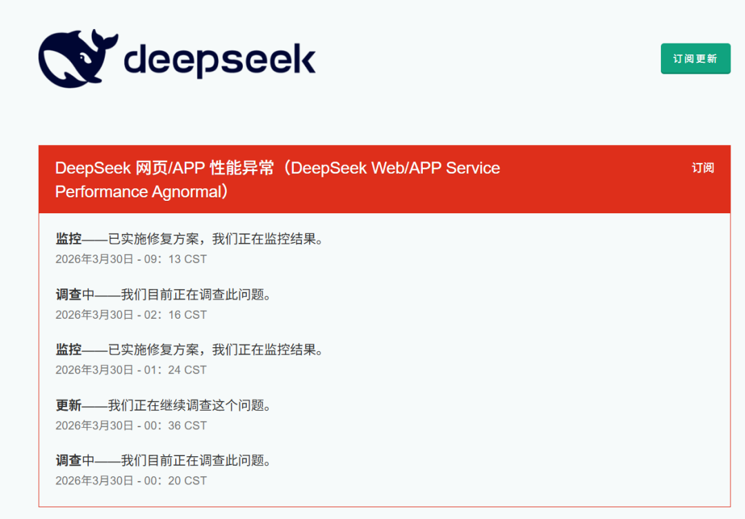 随后中新经纬查看其官网的产品服务状态日志,30日凌晨2点16分的记录显示,DeepSeek网页端和App出现性能异常,工作人员正在调查问题;上午9点13分的监控信息显示,修复方案已实施,目前正在监控修复结果。
