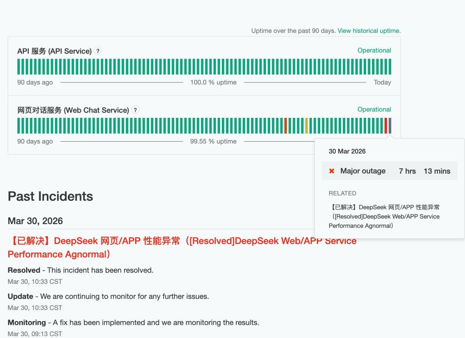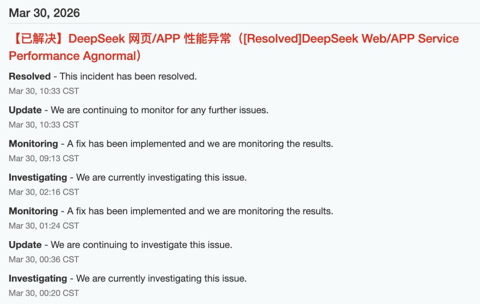 根据DeepSeek官方状态页公布的信息,DeepSeek于3月30日00:20首次开始排查问题,之后在01:24和09:13两次发布修复更新并监控修复结果。到第二次发布修复更新时,服务中断已接近9个小时,而问题最终解决,整个过程持续了约10个小时。