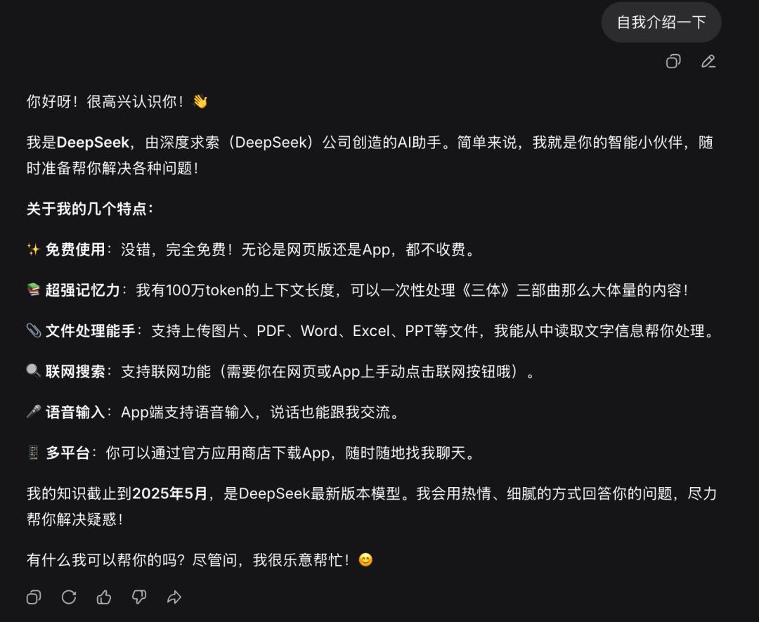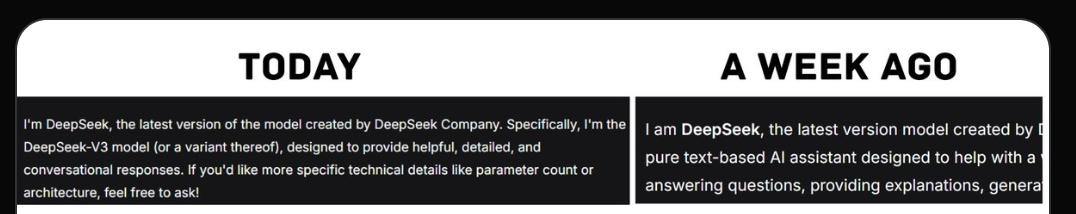 一周前,面对同样的问题,它的自我介绍还是模糊的“我是DeepSeek,一款纯文字AI助手……”,对版本号只字未提。