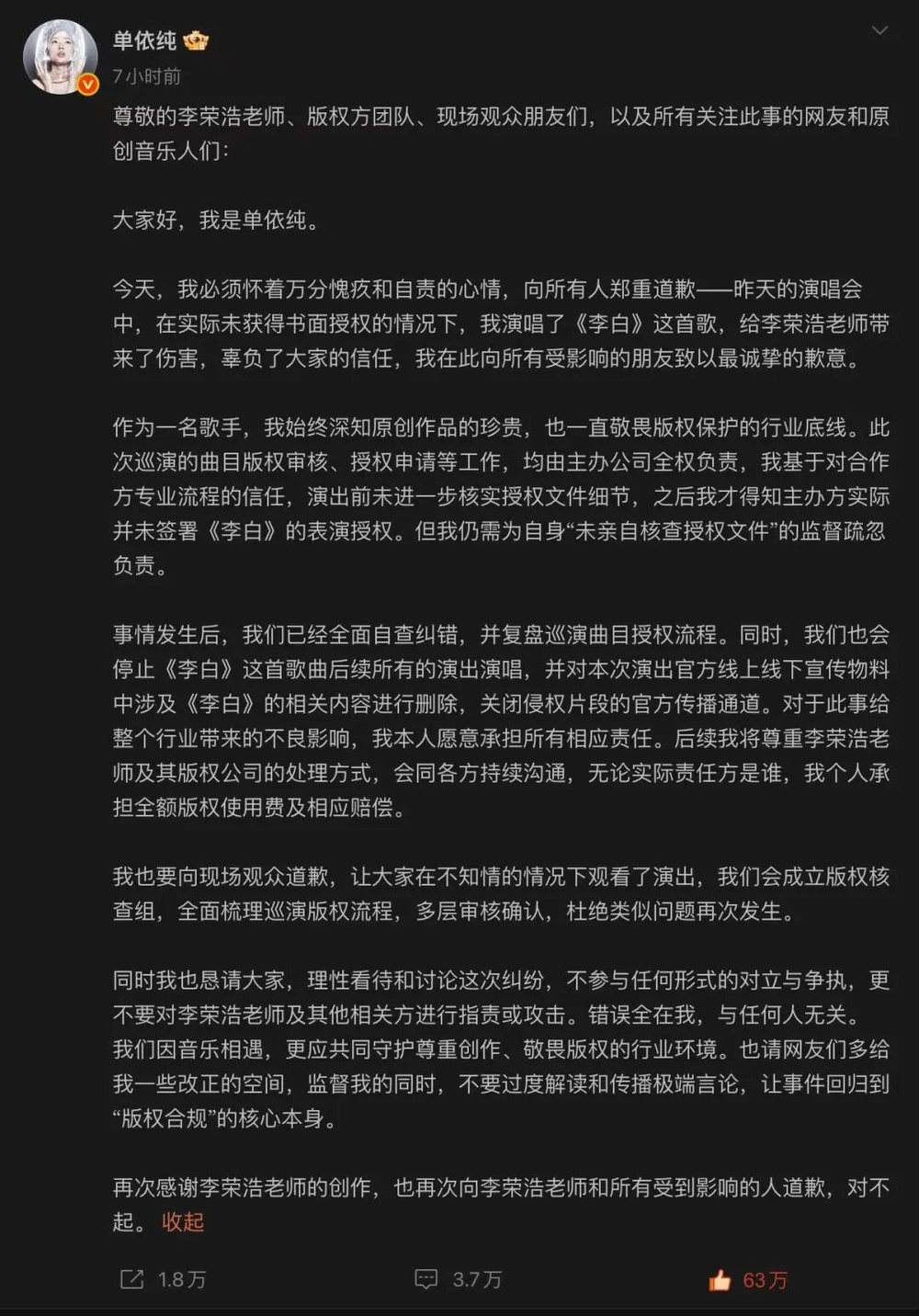 单依纯公开致歉,明确承认问题所在,说明巡演曲目的版权审核与授权申请均由主办公司全权负责,并提出了具体的整改措施:开展自查纠错、停止演唱相关曲目、删除涉事内容、复盘工作流程、成立版权核查组以及进行多层审核确认。其态度诚恳,整改动作具体明确。