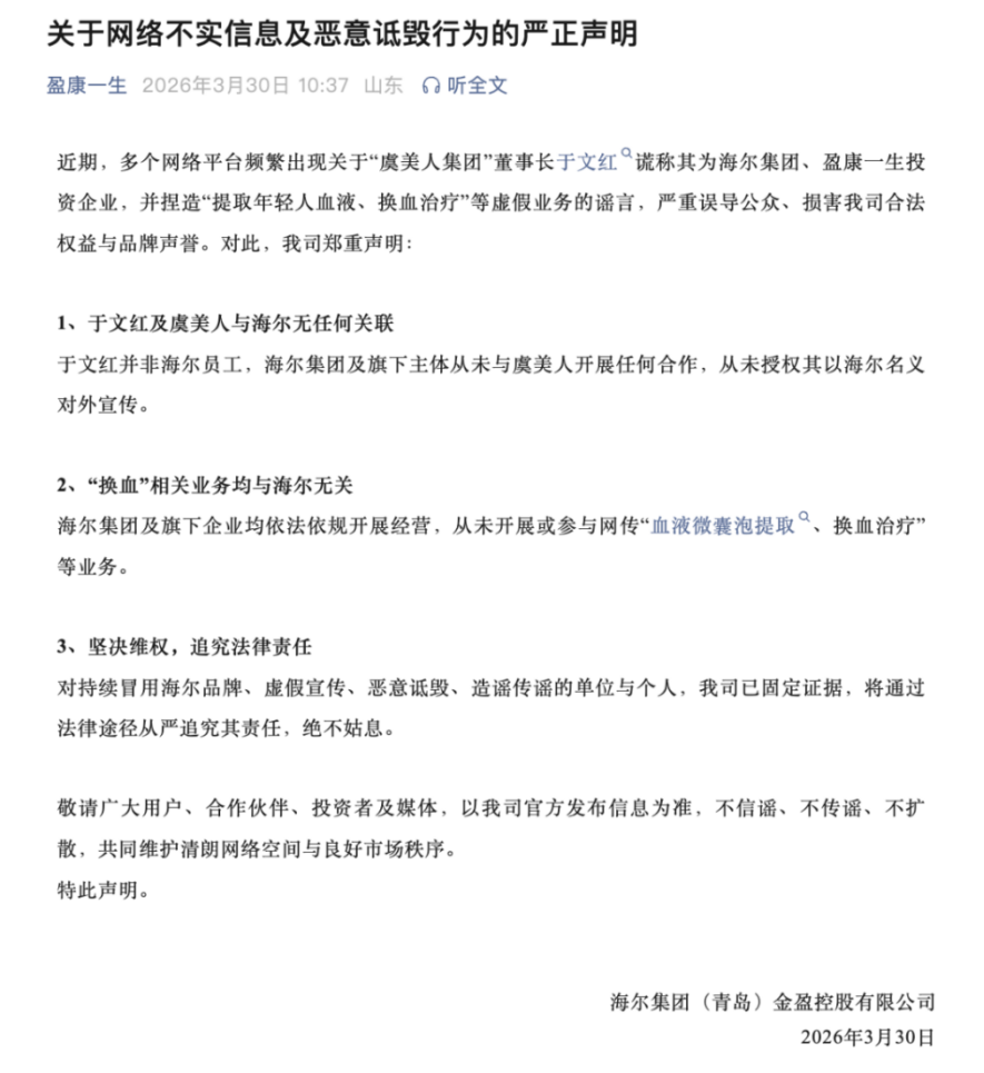 近年争议仍在发酵。2026年初,于文红因在社交平台对柏荟医疗创始人郑涵文发表贬损言论,被判网络名誉侵权并公开道歉;近期,海尔金控又紧急辟谣,澄清于文红谎称虞美人获海尔投资、捏造“换血治疗”等虚假业务,强调双方并无任何合作,并表示将依法追责。
