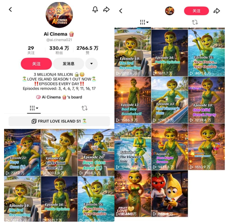 《Fruit Love Island》是当前TikTok上最热门的短剧IP。TikTok账号@ai.cinema021于今年3月13日上传首支影片,仅9天粉丝就迅速增长到300万+,成为TikTok涨粉最快的账号之一。