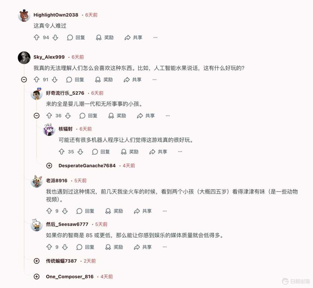《Fruit Love Island》或许并非证明AI已能创作更好的内容,而是证明它已能高效复制原本最易吸引注意力的内容,从而实现某种“破圈”。真正让人不安的,不只是内容是否“低质”,更是当这类高刺激、强冲突的内容被进一步低成本、规模化生产后,我们本就有限的注意力将何去何从。
