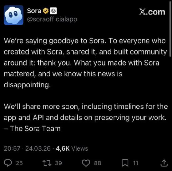 3月25日,OpenAI宣布关停Sora——这个让贾樟柯称赞“确实厉害”、令整个影视行业集体焦虑的AI视频工具,上线仅半年就被其创造者关闭。