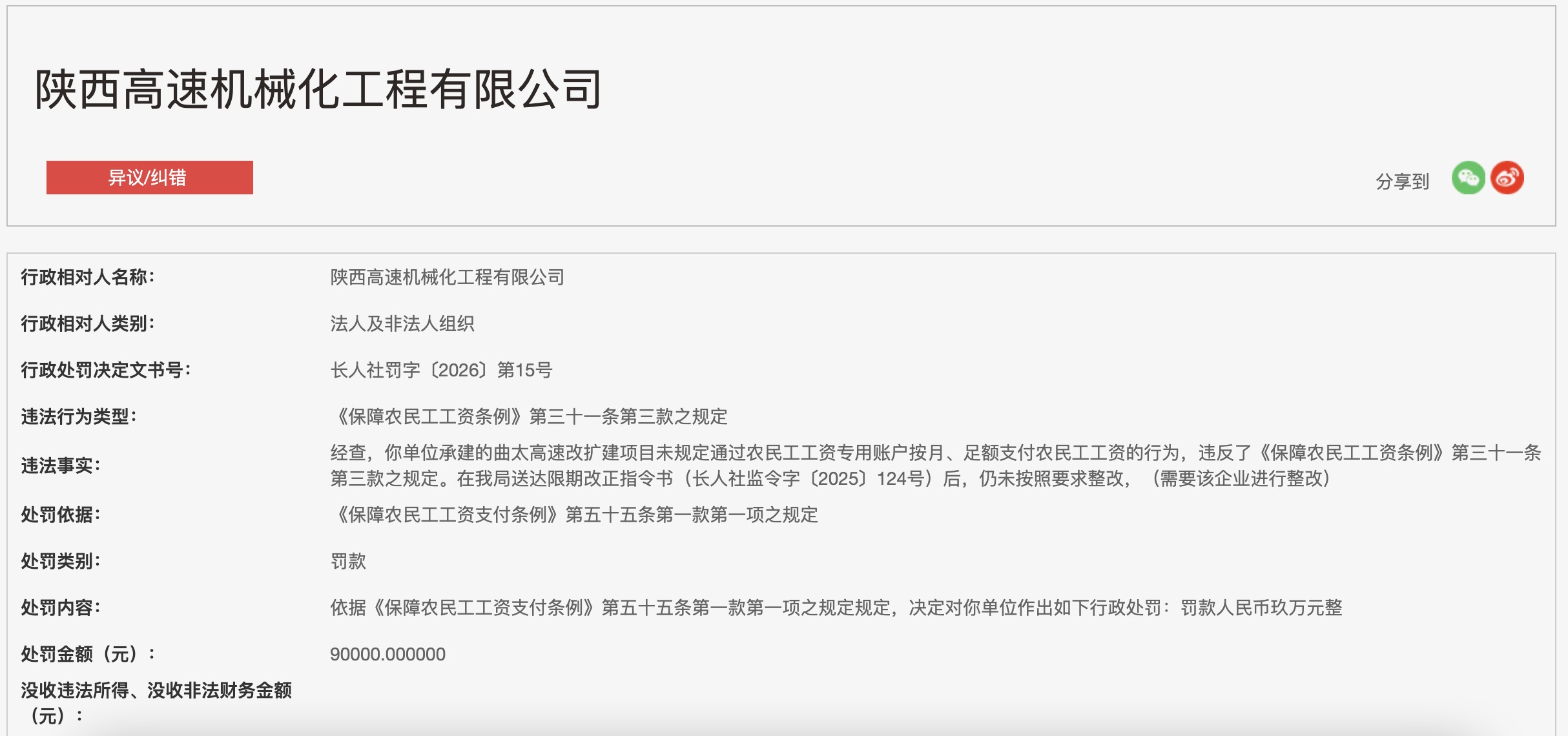 未依规支付农民工工资且拒不整改 陕西高速机械化工程公司被罚9万元