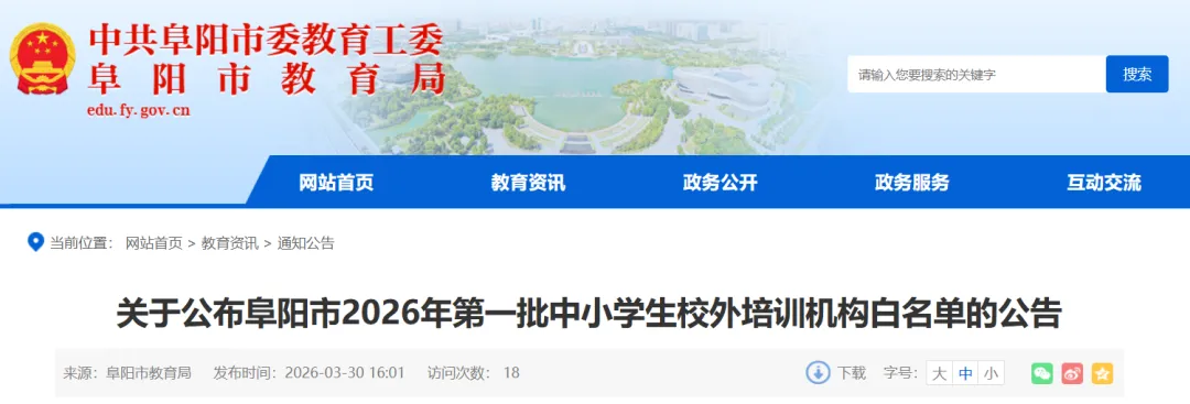 为深入落实国家“双减”政策要求,持续加强校外培训机构监管力度,有效保障家长与学生的合法权益,现对阜阳市2026年第一批176家资质完备、已纳入“全国校外教育培训监管与服务综合平台”统一监管且经主管部门审核确认的中小学生校外培训机构“白名单”予以公布(具体名单见附件)。该“白名单”将实施动态管理,对于已审批或已注销的机构,会通过“全国校外教育培训监管与服务综合平台”及时更新信息。同时,在此温馨提示各位家长和学生,选择校外培训时需保持理性谨慎,自觉拒绝违规培训行为,切实维护自身合法权益。