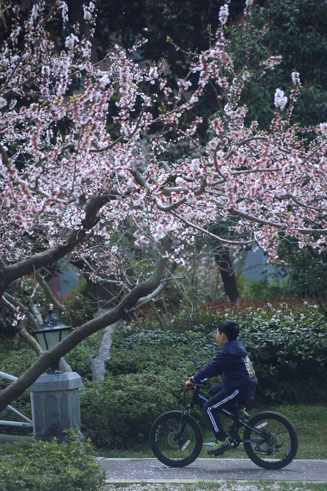 粉白花瓣轻轻落在肩头