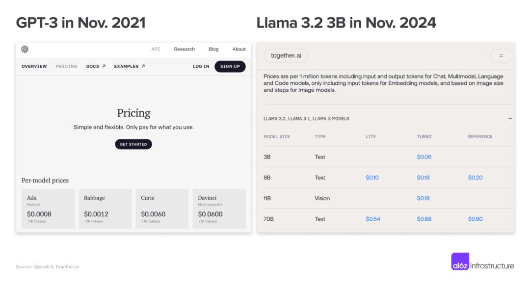 GPT-3开放时,它是唯一一个能达到MMLU 42分的模型,成本为每百万tokens 60美元。三年后,能达到同样分数的最便宜模型是Together.ai,成本仅为每百万tokens 0.06美元。