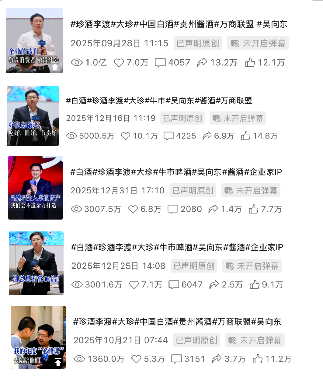 集团董事长吴向东亲自做内容,个人视频号不到一年发布160余条内容,总播放量6.8亿,单条最高播放破1亿,18条视频播放量超千万,登顶“企业家视频IP100榜单”榜首,用接地气的方式将品牌故事触达消费者与经销商。