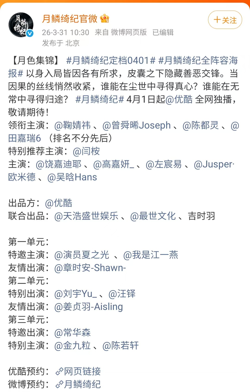 在偷税漏税实名举报风波引发舆论热议的敏感时刻,《月鳞绮纪》于3月31日突然官宣定档,将于4月1日正式开播。