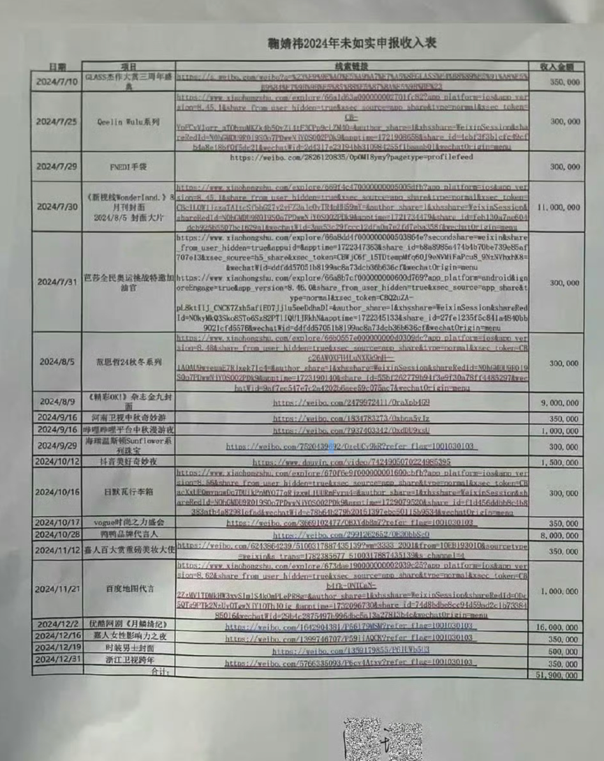 举报函显示,鞠婧祎2024年全年申报收入为1100.18万元,但仅2024年6月至12月期间,她参与影视、商务活动的收入保守估计就超过5000万元,瞒报比例接近88%。国家税务总局上海市税务局稽查局已出具“接收回执”。