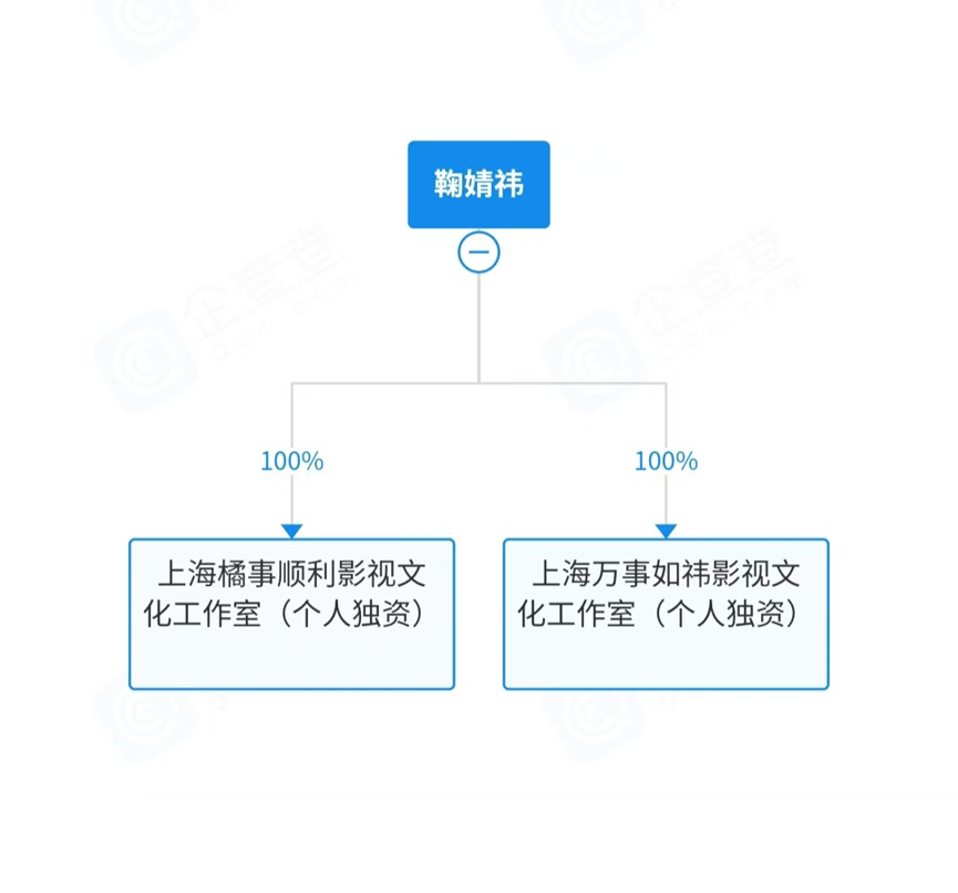 企查查APP显示,鞠婧祎名下关联两家企业,分别是上海橘事顺利影视文化工作室(个人独资)、上海万事如祎影视文化工作室(个人独资),两家企业均由鞠婧祎全资持股并担任投资人。
