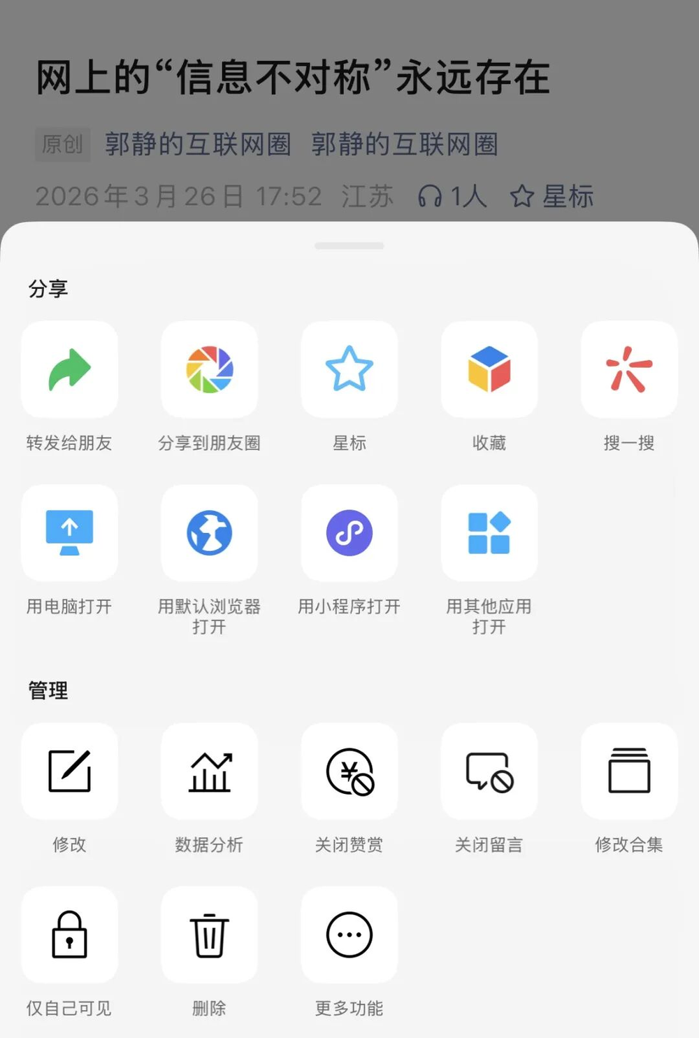 据郭静的互联网圈观察,微信近期正在灰度测试一项新功能——公众号作者可直接在文章页面完成文章的管理与修改。当公众号作者发布文章后,在微信端打开该文章页面时,可通过下方的“转发”按钮或右上角的“...”图标找到专属的“管理”版块,此版块仅公众号作者可见,普通用户及非号主本人无法使用。
