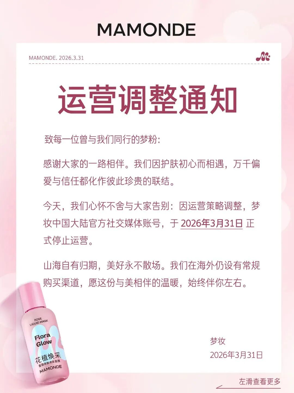 根据公告内容,梦妆将停止运营中国大陆地区的官方社交账号,并逐步关闭天猫、京东、抖音等线上官方店铺。具体关店时间为:抖音店铺于4月21日关闭,京东店铺于5月11日关闭,天猫旗舰店则在5月21日彻底停止运营。
