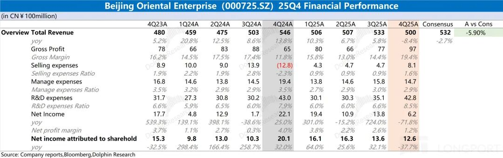 1. 整体业绩:2025年第四季度,京东方实现营收500亿元,同比下滑8.4%。其中面板市场价格同比微降约1%,出货量下滑是营收下降的主因。
