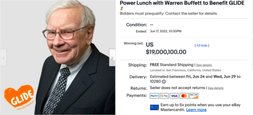 (图:2022年巴菲特午餐被匿名人士以1900万美元拍得,此后项目宣布收官)